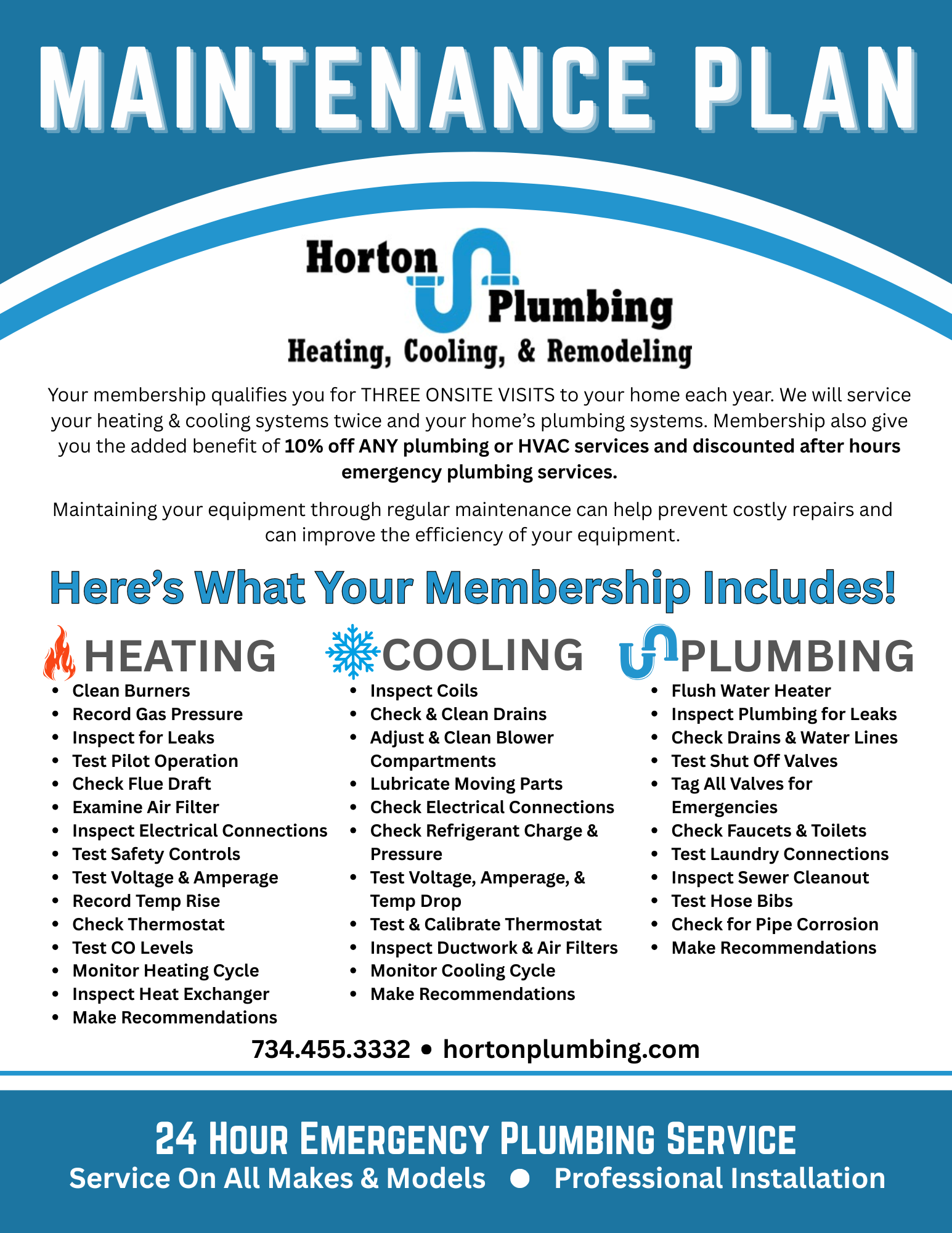 Your home’s plumbing, heating, and cooling systems work hard every day—and regular maintenance is the key to keeping them running at their best. Horton’s Maintenance Plan makes it simple to protect your investment with scheduled visits, priority care, and exclusive savings.
